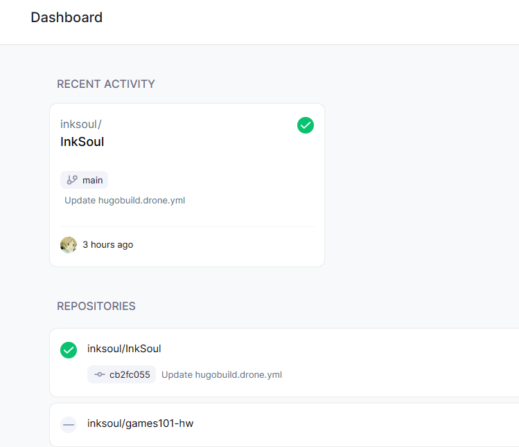 一切正常地部署完成后,便可以在drone的首页看到自己在gitea上的所有项目,可以查看build情况和设置对应的选项