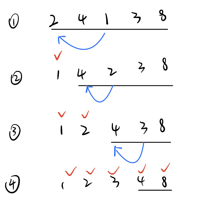 - 某节点前是排好序的,节点后是未排序的,未排序数据从后向前一一比较大小并交换数据,边比较边移动元素