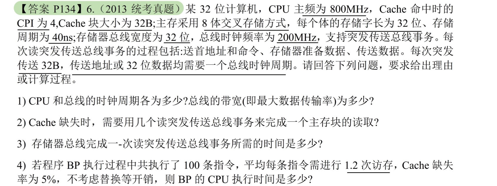 Cache块32B,Cache缺失时要一个读突发传送总线事务读取一个主存块
