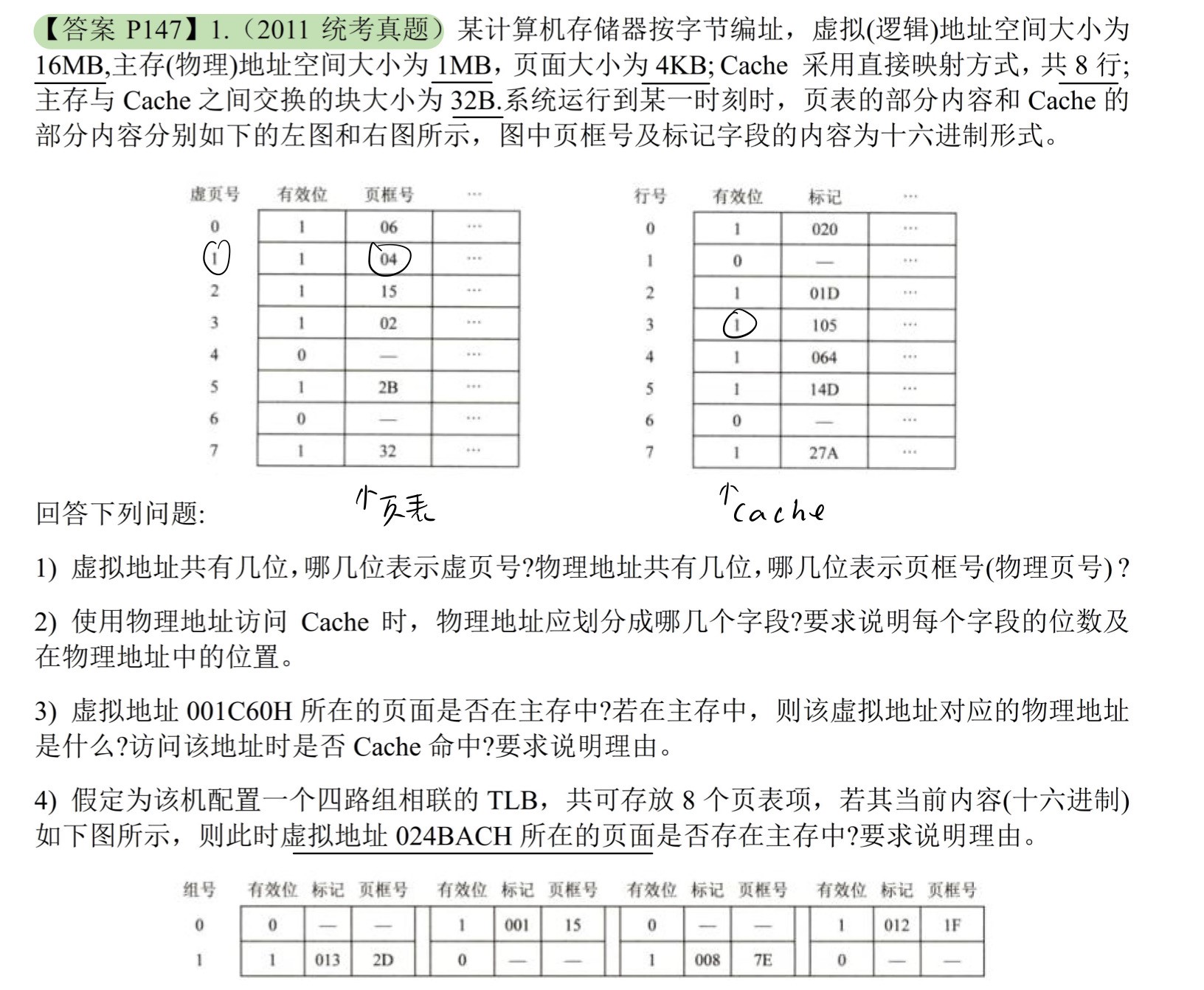 虚页号为0000 0010 0100B,TLB标记为0000 0010 010B = 012H,组号为0