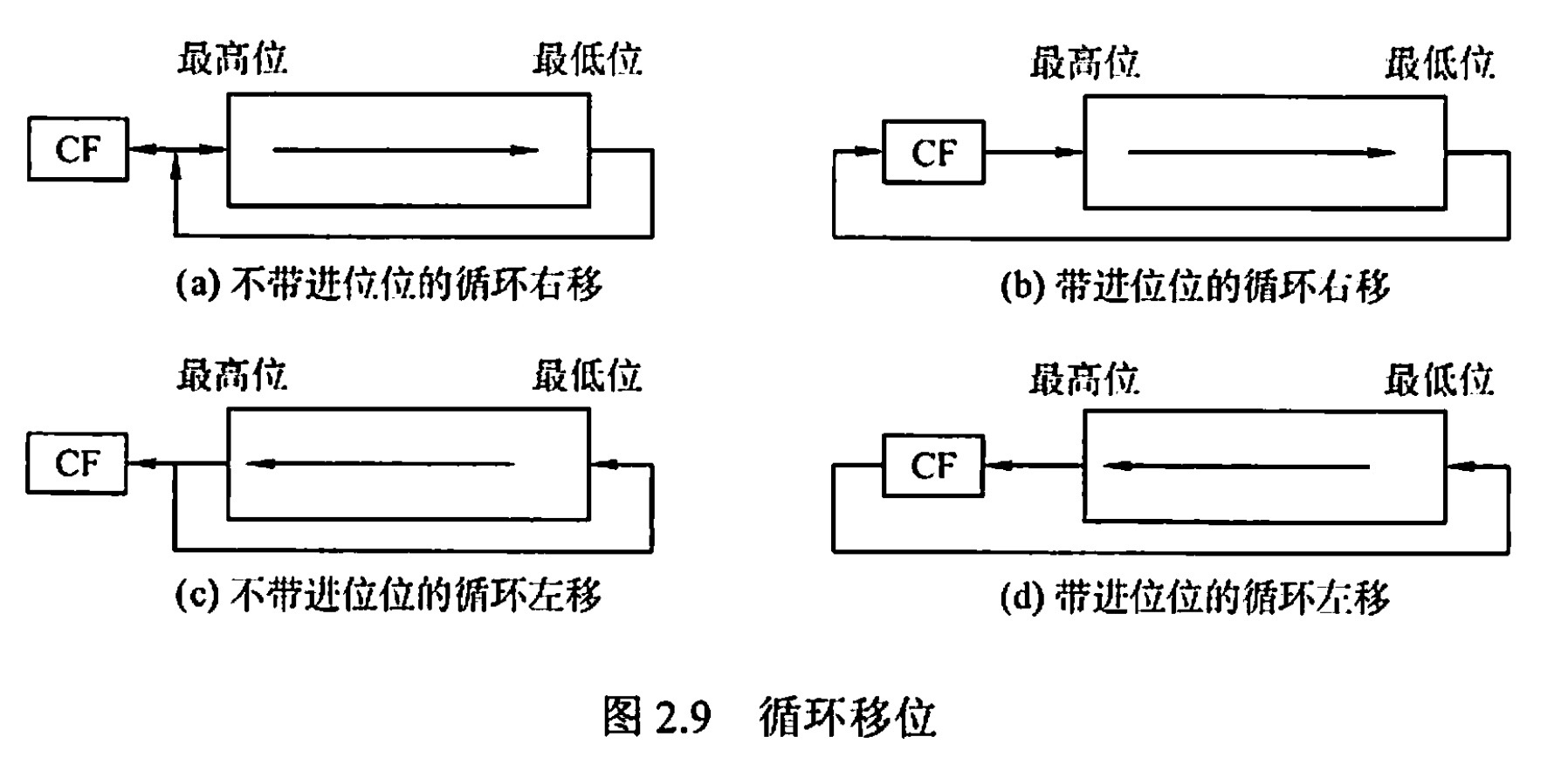 - 移出的数位又被移入数据中,而是否带进位则要看是否将进位标志符加入循环位移