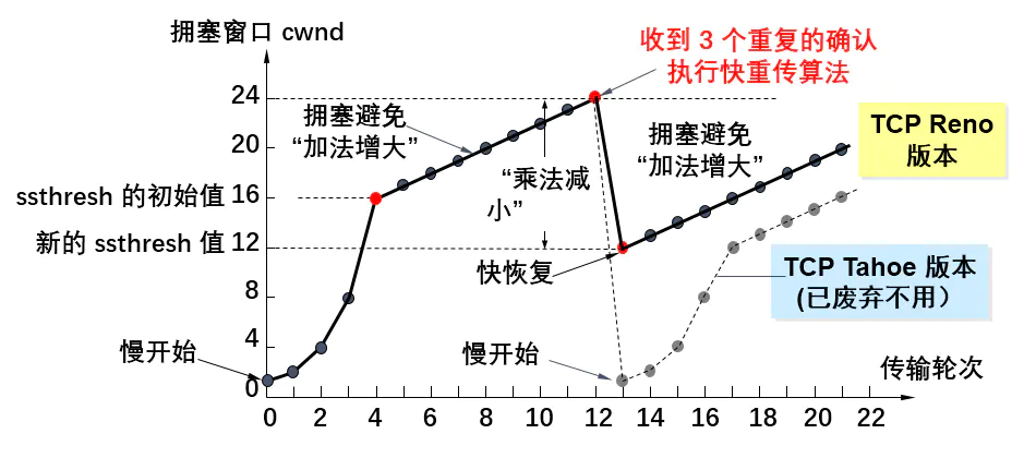 - 当发送方连续收到3个冗余ack时,执行乘法减小算法
