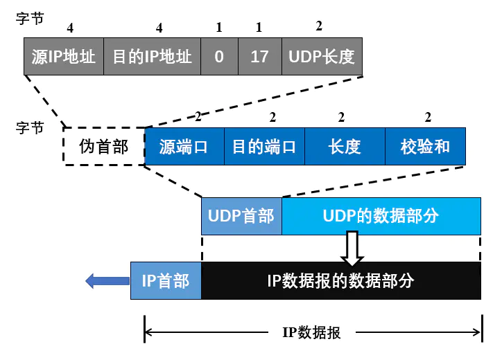 - 伪首部既不向下传送也不向上递交,只是为了计算校验和