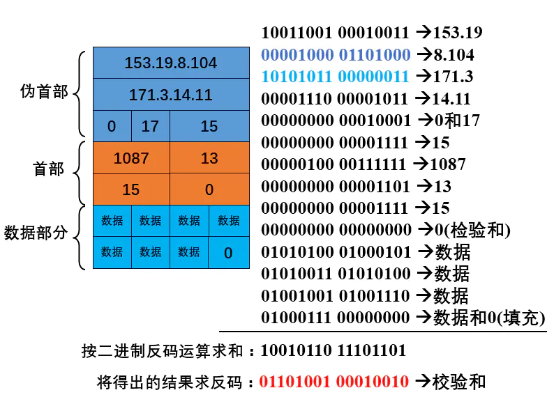 - 将伪首部和UDP用户数据报(首部和数据部分)看成是以16位为单位的二进制组成,依次进程二进制反码求和