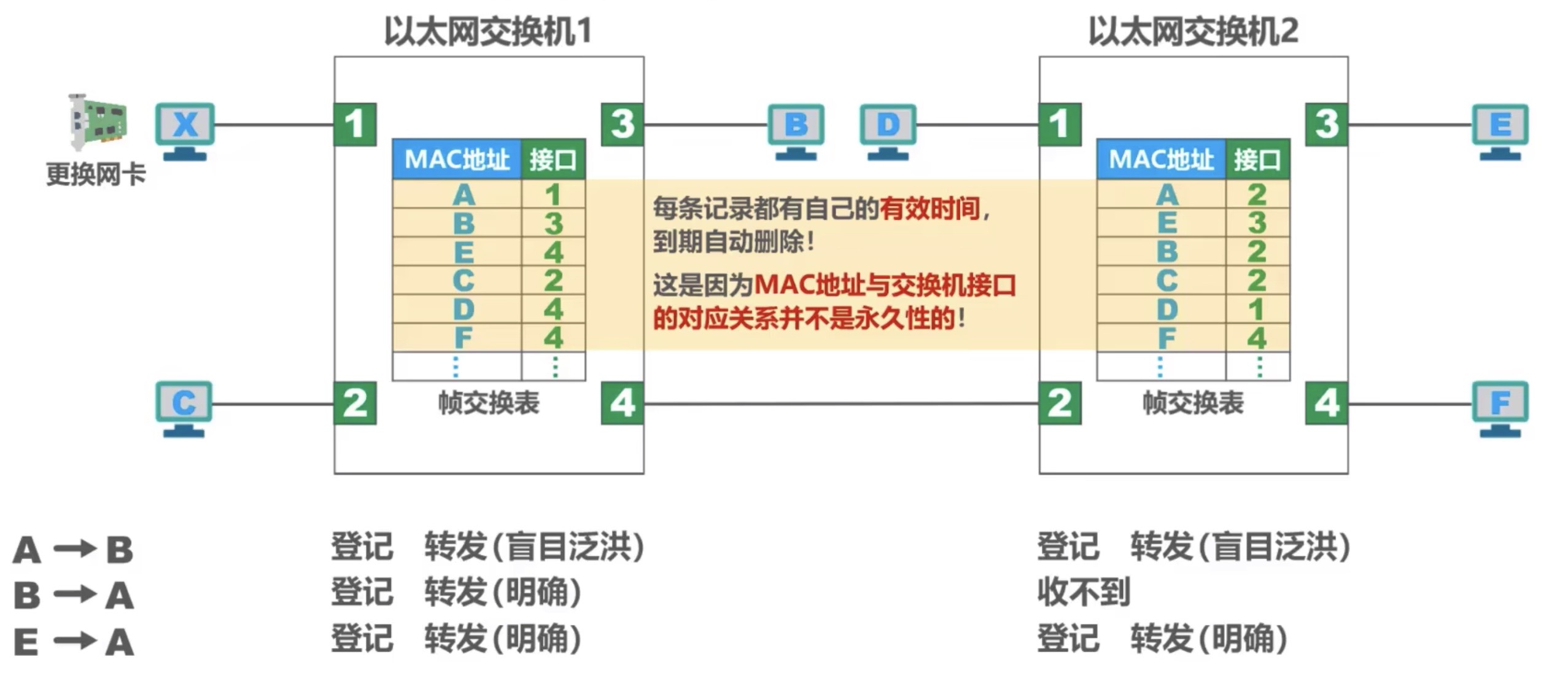 - 随着网络各主机间的通信,以太网交换机通过自学习算法自动逐渐建立起帧交换表