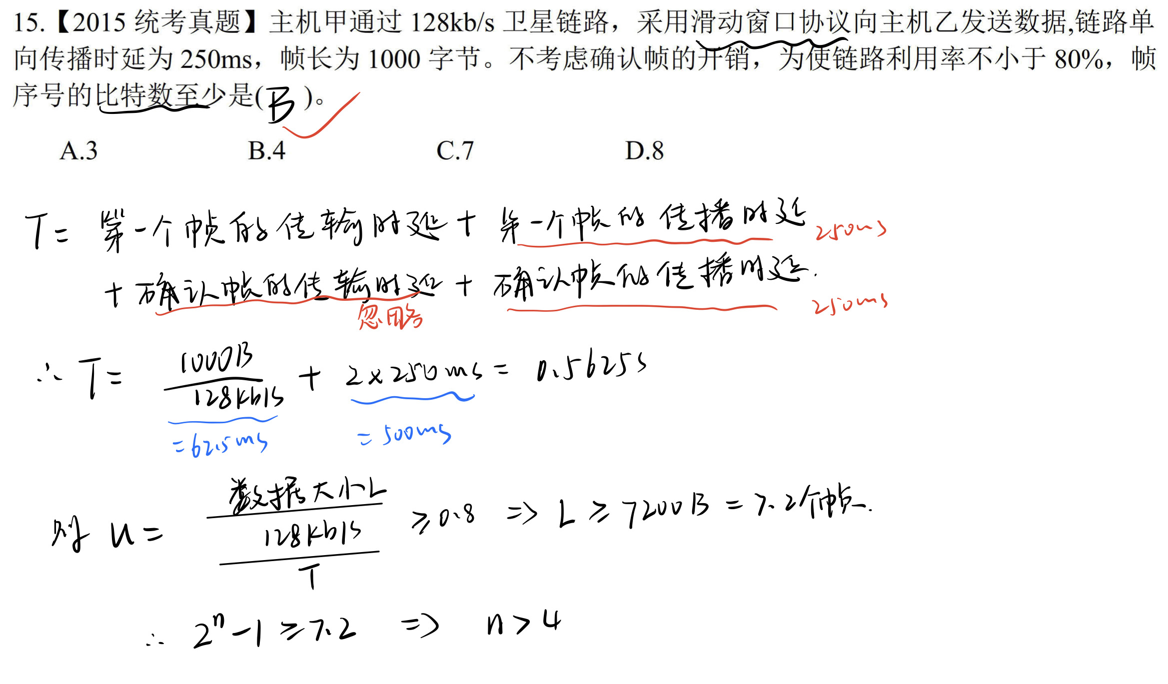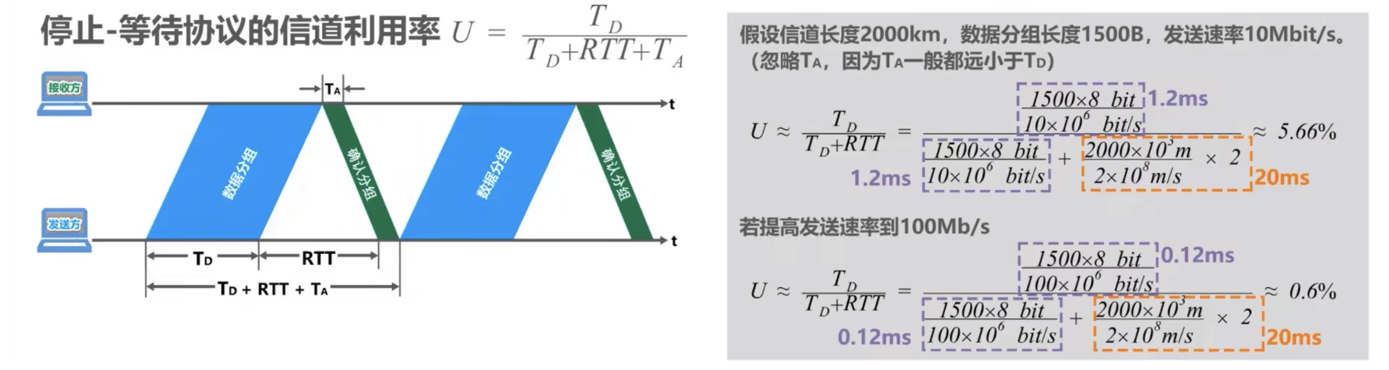 - 当往返时延RTT远大于数据帧发送时延TD时【如卫星链路】,信道利用率非常低