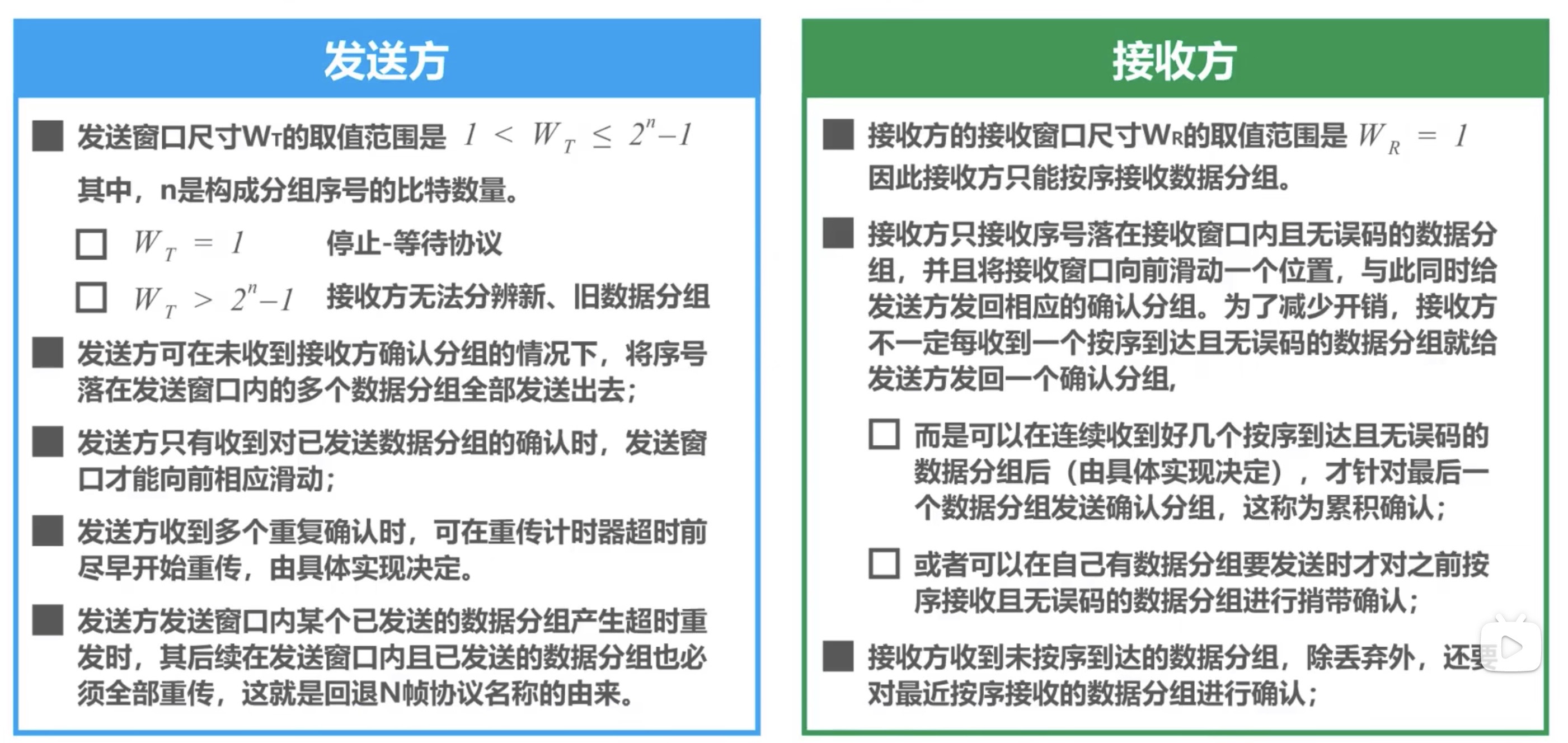 GBN协议 | 1<发送窗口$\leq2^n-1$;接受窗口 = 1 |