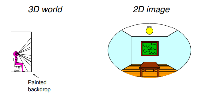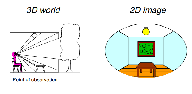 坐在房间的一侧往窗户的一侧看,三维和二维的情况是下面这样的