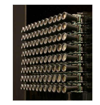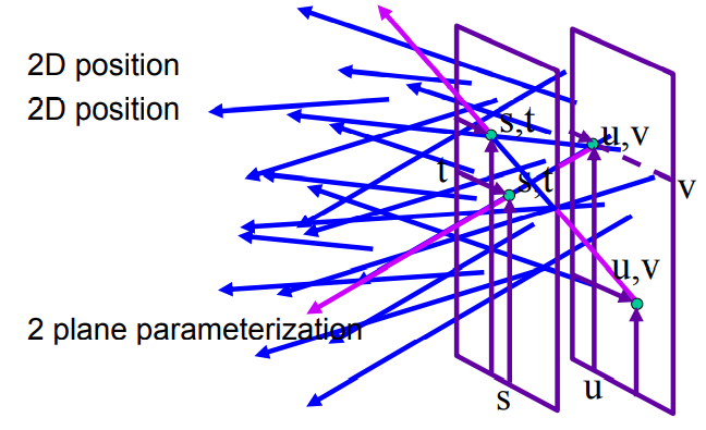 很多摄像机从某一个角度看向世界,拍一张图,然后将所有图都组织到一块,就是整个光场。如下图,斯坦福做了一个摄像机的矩阵,相当于在不同的位置对场景拍不同的图,每个位置对应一个u、v,拍到的照片是s、t,相机本身二维,成像结果二维,综合为四维