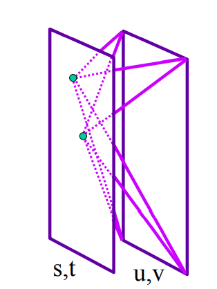 整个世界还是在s、t平面的右边,从u、v上的任何一个点都看向s、t上的同一点。就好像盯着同一个点,从不同的角度去看,会看到很多类似不同高光的东西