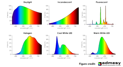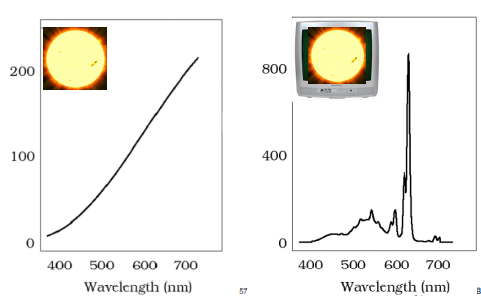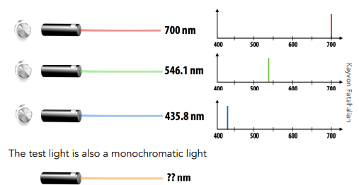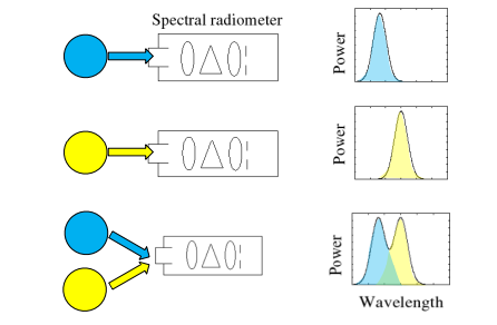 用一种光照亮能记录光强度的东西能够得到右边的另一种分布;两种光同时照亮得到的分布就是它们两个对应的SPD之和