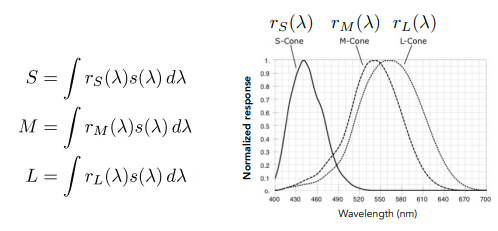已知光在不同波长上的分布(SPD),又知道某一种细胞对于某一个波长的响应是多少。感知的函数就是这2个函数对应的位置相乘积分起来