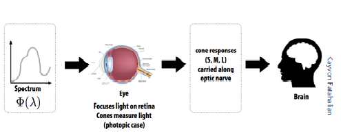 光线的光谱经过人的眼睛,反应到视网膜上,然后被三种不同的细胞感知到形成3个数,这3个数送到人的脑袋中,人就会认为看到了一个什么样的颜色