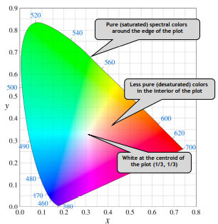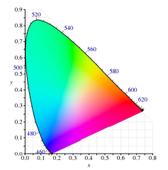 可见图中边界为扇形,这个就是色域,整个颜色空间可以显示的颜色