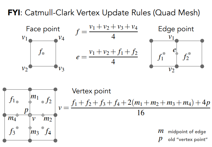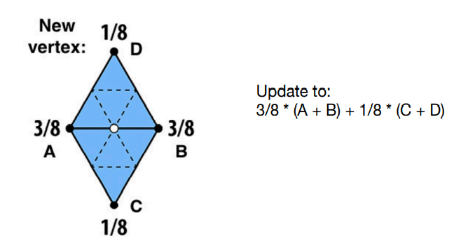 - 每次细分时在每个面中添加一个点,每条边的中点也都添加一个点,面上的新顶点连接所有边上的新顶点