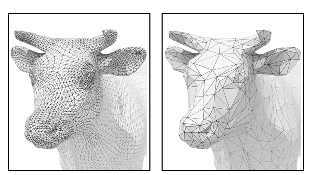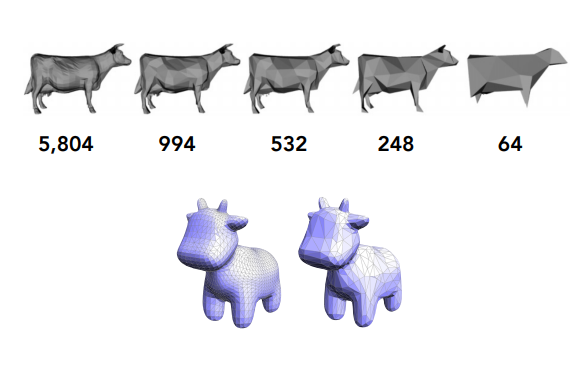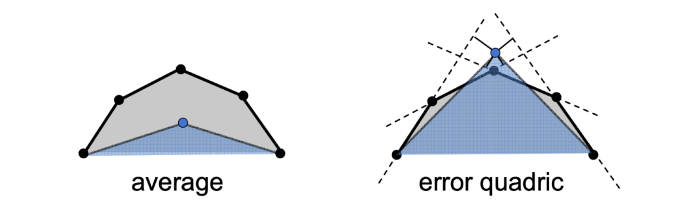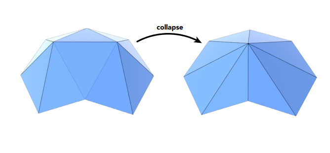 边坍缩是曲面简化的常用方法,如上图所示将一条边的两个顶点合成为一个顶点,出于尽量保持形状的目的,需要正确选择不影响或影响最小的边进行坍缩,由此引入二次误差度量(Quadric Error Metrics)