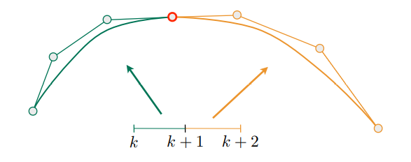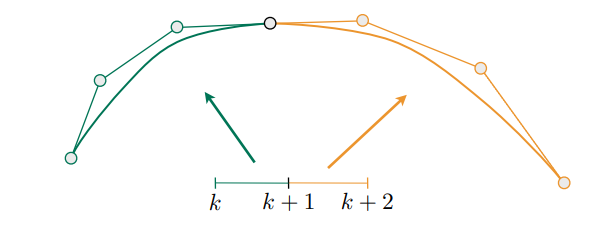 与末端线段相切:$b'(0) = 3(b_1 - b_0); b'(1) = 3(b_3 - b_2)$