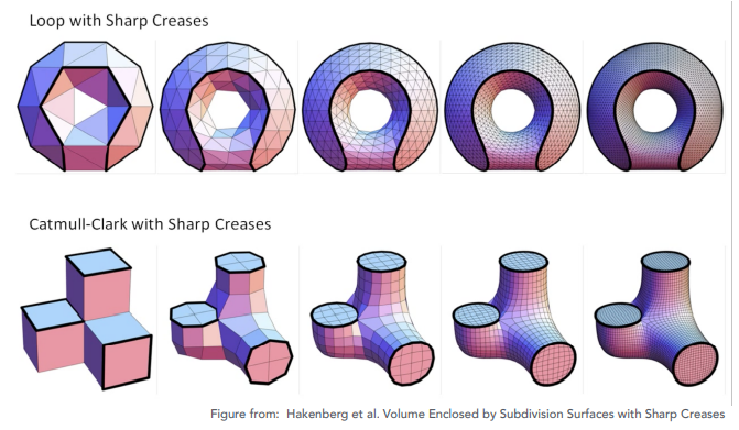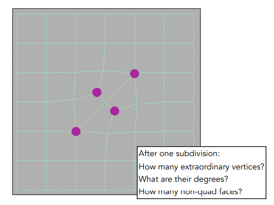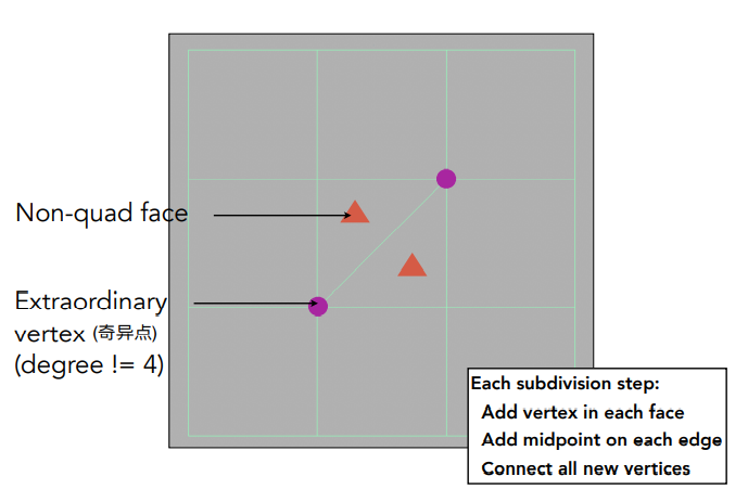 - 第一次细分后所有的面都会变成四边形,且后续奇异点数目不再增加
