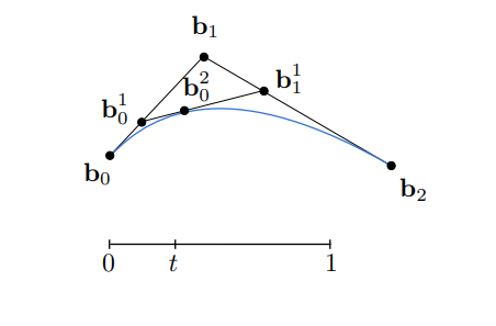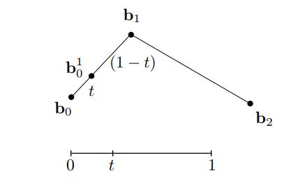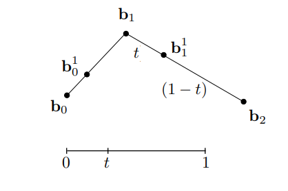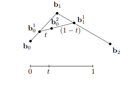 $$b_0^1(t) = (1 - t)b_0 + tb_1$$ $$b_1^1(t) = (1 - t)b_1 + tb_2$$ $$b_0^2(t) = (1 - t)b_0^1 + tb_1^1$$ $$b_0^2(t) = (1 - t)^2b_0 + 2t(1 - t)b_1 + t^2b_2$$