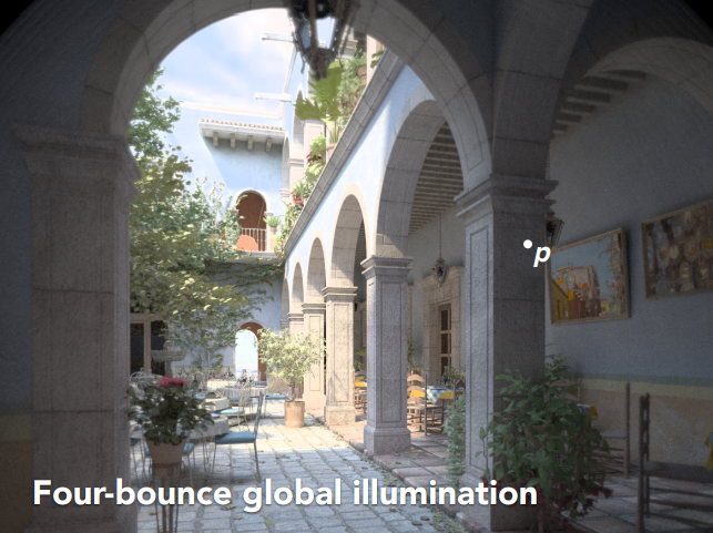 光线弹射一次得到为直接光照,弹射两次及以上为间接光照,所有光线弹射次数的项加起来的结果为全局光照(直接光照+间接光照)