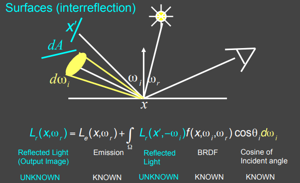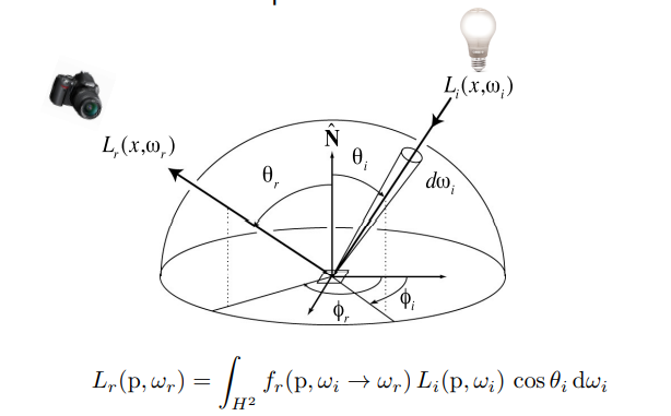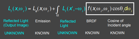 在某个方向看向一点时,我们不知道看到的能量(Lr)、从其他反射到这一点的Radiance,但其他项都已知,可定义物体的不同材质(diffuse、gloss、specular)