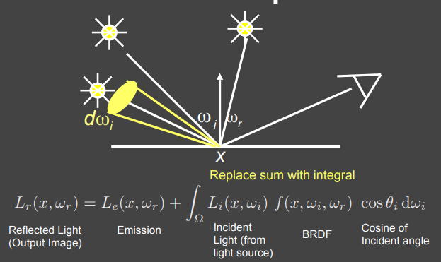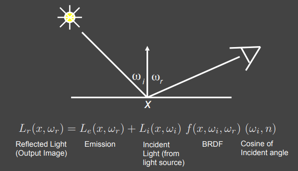 $$L_o(p,w_o) = L_e(p,w_o) + \int_{\Omega+} {L_i(p,w_i)f_r(p,w_i,w_o)(n\cdot w_i)dw_i}$$