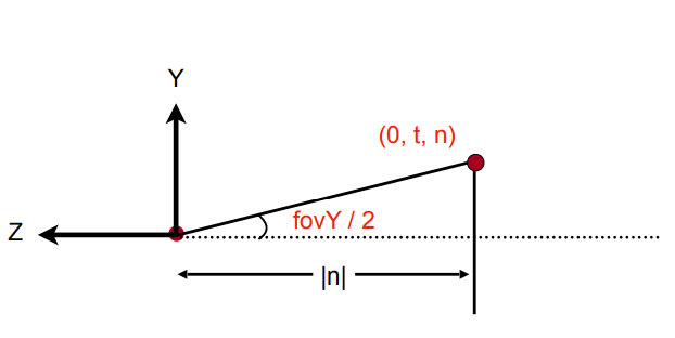 对应的相似三角形关系不变,参数改变 可得如下关系 $$\tan{\frac{fovY}{2}}=\frac{t}{|n|}$$ $$aspect=\frac{r}{t}$$ 因此 $$t=near\times tan(\frac{fovY}{2})$$