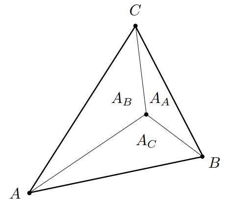 将点与三个顶点相连,三个三角形的面积分别为$A_A,A_B,A_C$对应的重心坐标的计算式,