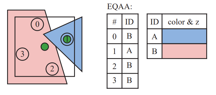 例如,EQAA在2f4x模式下,会对每四个采样点计算并通过表的形式存储颜色和深度值(如下图),这使得四个采样点只需1bit空间就可以确认像素位置的着色颜色值