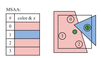 MSAA同样在一个像素中设置多个采样点,在光栅化时计算三角形在像素内对采样点的覆盖率,之后只计算每个片元的像素着色器,采样中心点的位置计算颜色信息再乘上覆盖率,最后输出这个像素的颜色