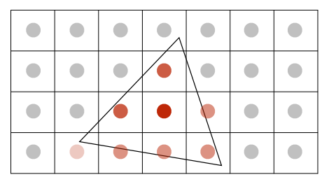 对于我们之前提到的采样,我们只对像素正方形的中心进行是否在三角形内部的判断,这意味着对于边缘的像素正方形,无论覆盖面积有多大,只要不包含中心点都会被判定在三角形外,从而不被渲染,当采样率提升,如下图的4spp(sample per pixel)以某种方式混合计算获得更好的像素效果