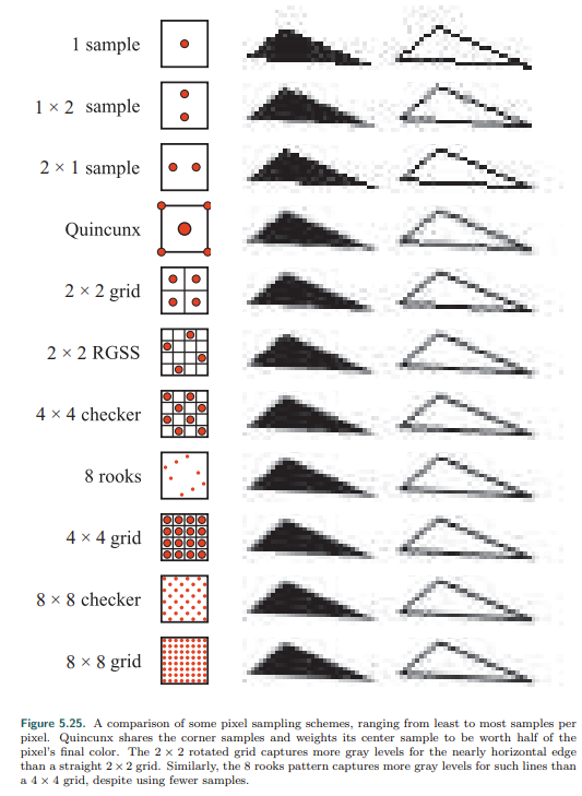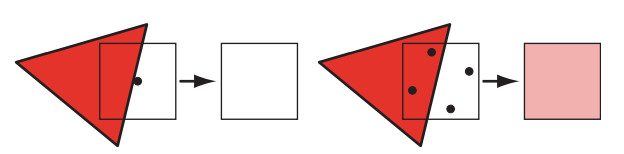 对整个像素内颜色的平均计算遵循: $$p(x,y)=\sum_{i=1}^nw_ic(i,x,y)$$ $n:$每个像素内采样点的数量