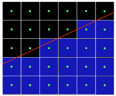 屏幕是由一个个像素组成,在光栅化时,只有中心被三角形覆盖的像素会被着色,而且被覆盖的像素点的分布往往是离散的,自然而然地形成如下图斜线形成的阶梯状的锯齿