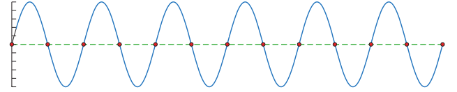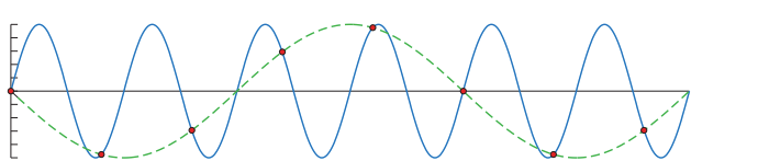 如果采样的频率过低,则会发生走样或混叠(aliasing),如图中,蓝色的为原信号,红色为采样点,绿色虚线为重建后的信号