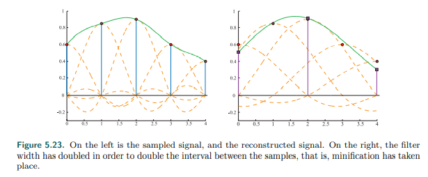 对于信号缩小的情况,我们需要先对1间隔采样信号使用$sinc(\frac{x}{2})$ filter 滤波产生一个连续信号,再重采样2间隔,由于频谱范围更大的低通滤波器才能过滤更多的高频信号,类似于对图像进行第一次模糊再重采样产生一个低分辨率图像