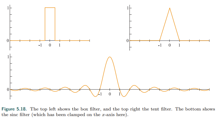 重建时需要采样信号进行滤波,通常使用下图中的三种滤波器(box filter,tent filter,sinc filter),且滤波器的面积必须为1以确保恢复的信号不会被放大或缩小
