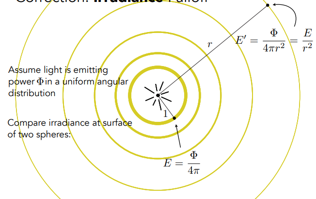采用辐照度则认为对于最中间的球壳来说,其半径为1,则下图中该点出的辐照度为$E = \phi / (4\pi 1^2 )$,球壳半径为r时,辐照度为$\phi / (4 \pi r^2)$,也就等于$E/r^2$