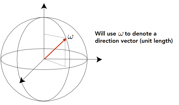 在辐射度量中,我们也会用$\omega$表示三维空间中的一个方向,可以使用$\theta和\phi$的方式来定义其位置,并利用$\sin \theta d_{\theta} d_{\phi}$来计算微分立体角