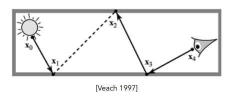 从光源打出一些sub-path,从摄像机出发也可以生成另外一系列的子路径。双向路径追踪会将这些子路径的端点连接起来形成一条完整的路径