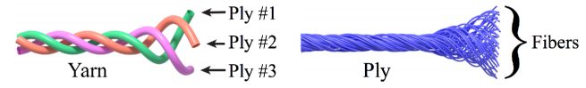 纤维(fiber)是最基础的,纤维可以缠绕成不同的股(ply),不同的股再经过不同的缠绕形成线(yarn)