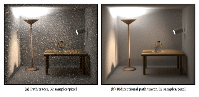 图例中,左图为路径追踪,右图为双向路径追踪,适用的都是每个像素32个采样点,但可见双向路径追踪能产生更好的效果