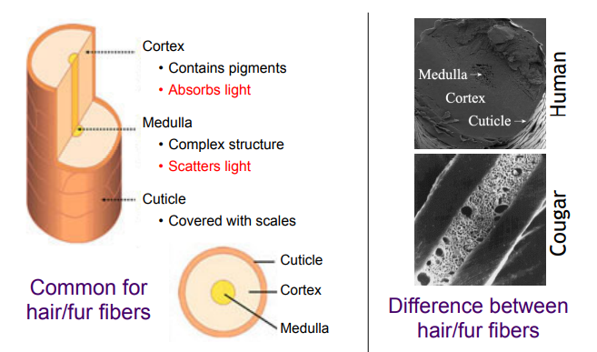 都有三个结构,cuticle(表皮)、cotex(皮层)、Medulla(髓质,复杂内部结构,光线进入后会反射到各个方向)