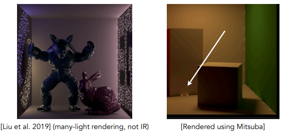 从光源打出很多光线子路径(light sub-path),这些光会停在某些地方,认为停的位置就变成了新的光源(VPL)