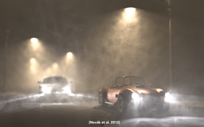 光线在散射介质内部能传播多远是有这个介质的吸收能力决定,当传播停止后再考虑光线的反射方向,与光在物体表面的弹射类似,只是中间的任何一个点都有可能会发生方向的改变。但始终会找到一个path,在将弹射点和光源相连,计算整个路径的贡献(不考虑Rendering equation,因为渲染方程描述物体表面与物体的作用而非体积间的相互作用)