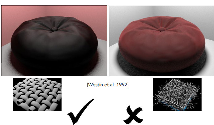 所以将织物认为是在空间中分布的体积,然后可以将其划分成超级细小的格子,每一个格子里面大概知道纤维的朝向、分布、复杂程度等等,那就可以将这些性质转化成光线的吸收和散射。将这些性质转换成对云烟雾这种反射介质的渲染,不再将布料当成一个面,而是当成一个体积,体积中任何一个微小的块都知道它的性质