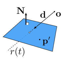 对应的平面方程(Plane Equation)为: $$P:(p - p') * N = 0,\ \ \ ax+by+cz+d = 0$$